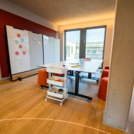 - Ausstattung: 4 höhenverstellbare Schreibtische, 4 Bürostühle, 2 Pinn-/Magnetwände (die gleichzeitig Akustiktrenner sind)
